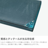 型押し牛革にシルバーの刷毛ムラプリントを施した、エレガントな長財布。シルバープリントと角に施したクリアブローチは、光を通したり反射したりと、ダウンライトや太陽の下で映えるデザインに。ブローチの仕様は面を取っているため手触りがよく、樹脂の中にゴム成分を配合することによって割れにくい仕上がりになっているので、安心してお使いいただけます。