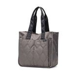 上品な光沢の撥水ナイロンに、キルティングポケットが映える縦型トート。仕切り付きの内装はペットボトルや水筒も立てて収納でき、荷物の定位置が自然に決まるから中身もすっきり。しっかりとマチがあり、通勤・通学・ママバッグにもおすすめ。毎日使いたくなる軽量仕様です。